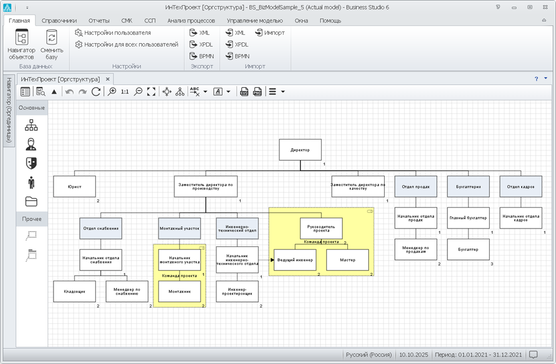 Использование специализированной информационной системы, такой как ИС "Business Studio", значительно облегчает процесс моделирования организационной структуры. В системе можно создавать иерархические диаграммы, отображающие уровни подчинения, а также задавать функциональные связи между подразделениями. ИС "Business Studio" позволяет добавлять сотрудников, роли и подразделения в структуру, связывать их с бизнес-процессами, что обеспечивает прозрачность распределения ответственности и контроля.