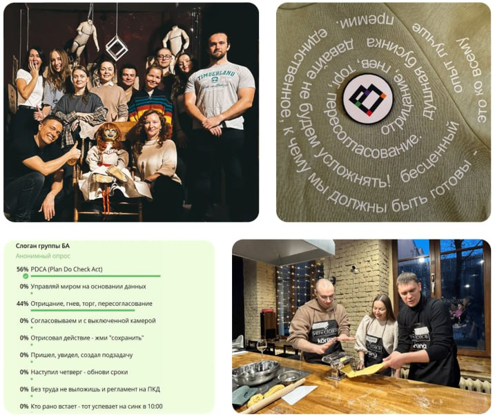 Кроме того, мы учимся друг у друга на командных встречах и мастер-классах, а также совершенствуем свои навыки, посещая внешние обучающие тренинги, курсы и вебинары. Всегда с радостью участвуем в корпоративных мероприятиях и челленджах и проявляем креатив в различных активностях. И немного шутим – поэтому группа бизнес-анализа придумала свой слоган «отрицание, гнев, торг, пересогласование», который появился на мерче компании.
