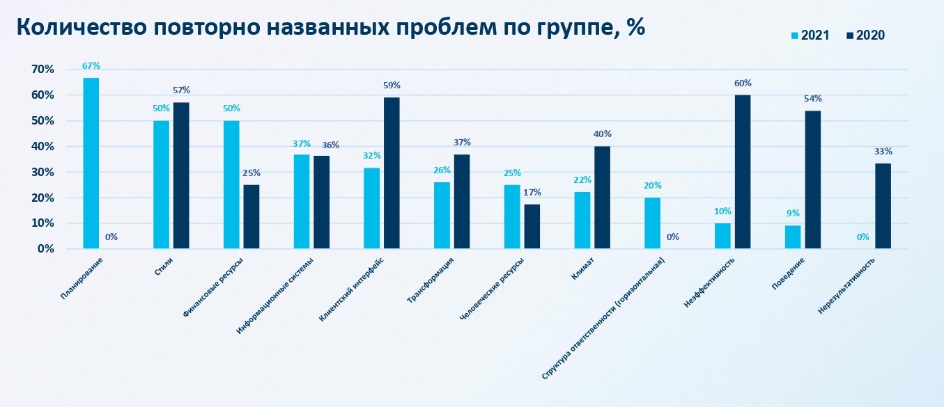 Мы следим за тем, насколько эффективно решаются выявленные с помощью Syndag проблемы. На диаграмме видно, что методика результативна. Например, проблемы, связанные с HR, были устранены полностью.