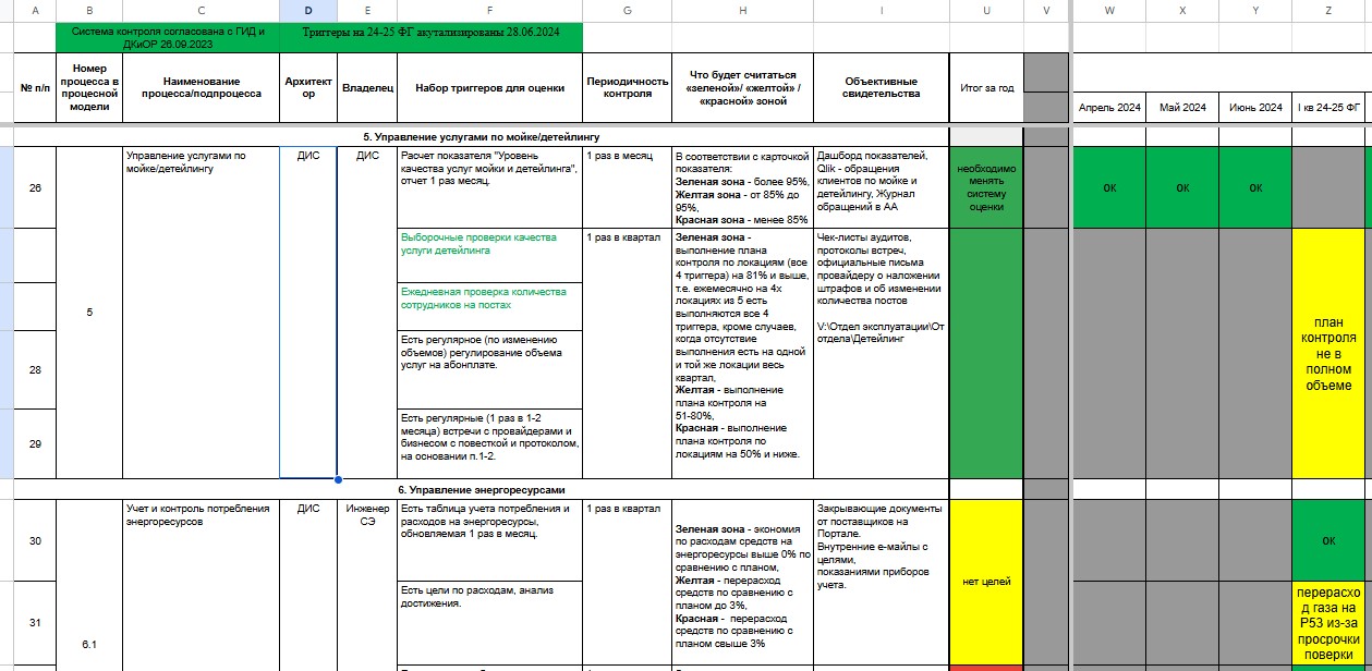В нашей модели описано около 600 бизнес-процессов. Для оценки их результативности мы разработали систему триггеров — таблицу с 5 контрольными точками. Их определяют владельцы процессов и руководители функций. Если более 80% показателей соблюдается в течение года, процесс считается эффективным.