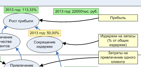 Для каждого показателя, в зависимости от изменения фактического значения по сравнению с прошлым периодом, отображаются стрелки различных направлений или "тренд":