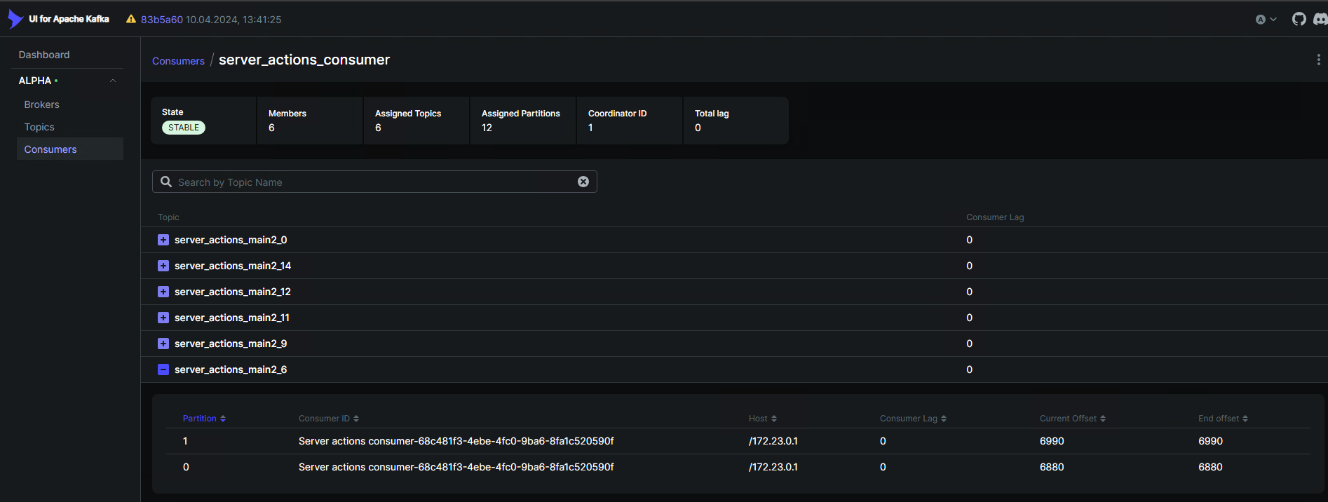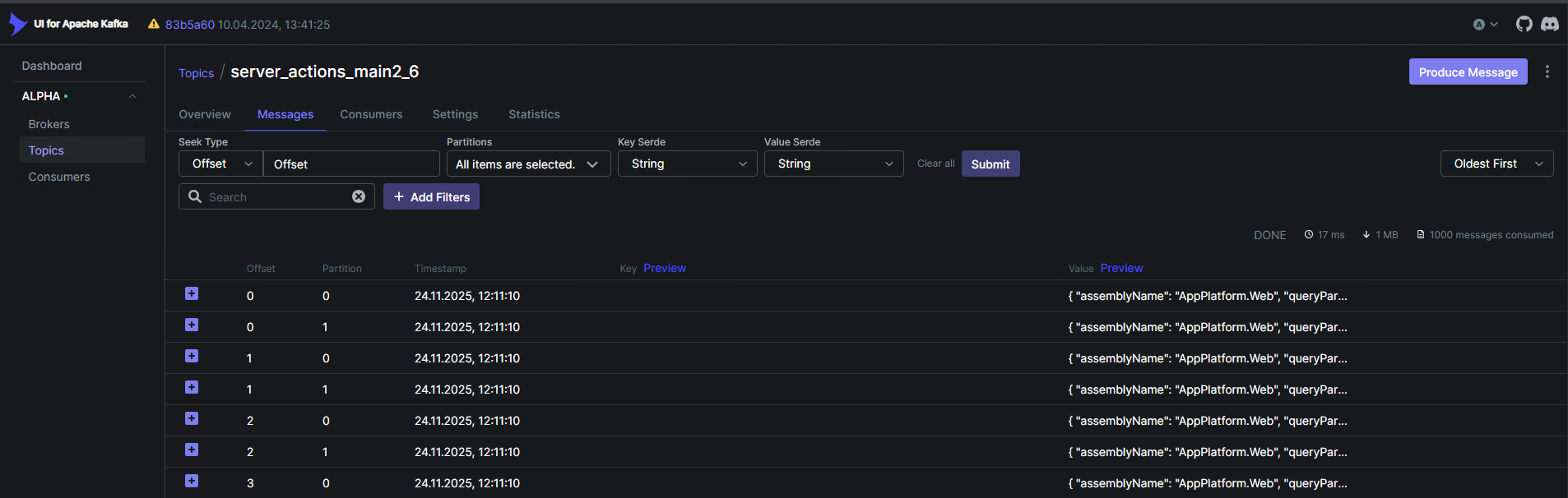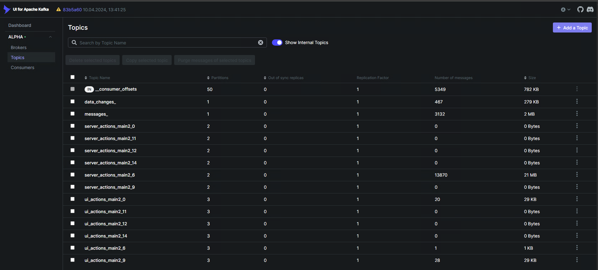 Здесь отображаются все очереди Kafka. Названия топиков (server_actions, ui_actions) включают имя базы данных и номер ветки, на которых запущены эти очереди (см. Рисунок 2):