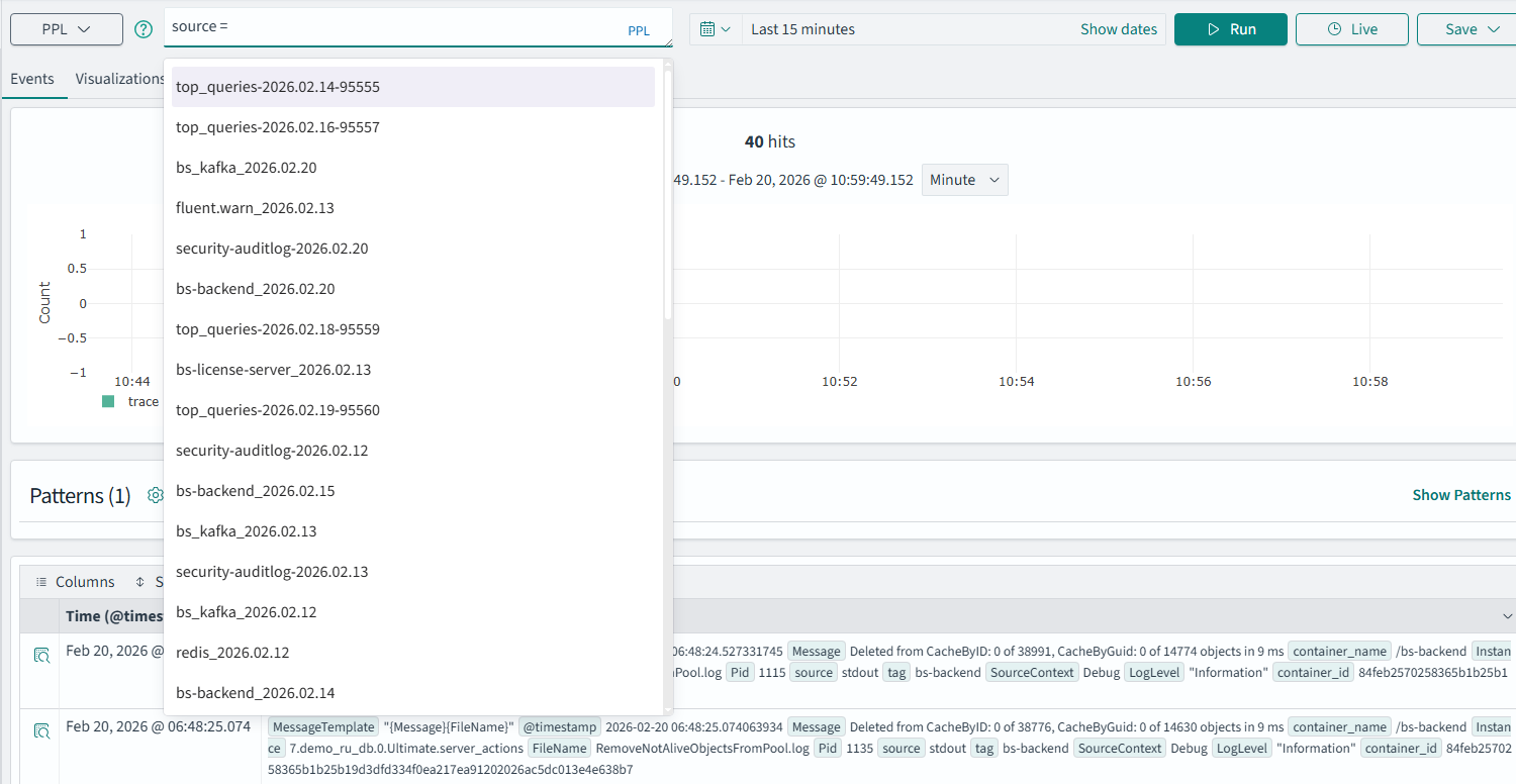 Примечание: индекс bs_* захватит всё, что начинается на bs_ или bs-. Таким образом логи сервисов bs-backend, bs-license-server и bs_kafka попадут в результат поиска.