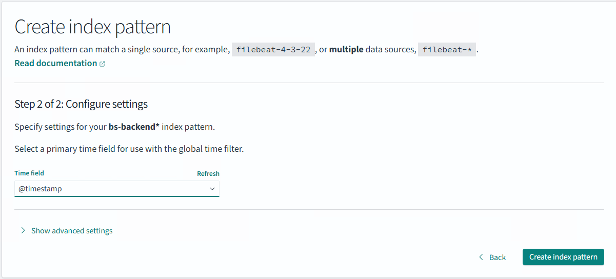 На втором шаге выберите @timestamp в поле Time field и нажмите на «Create index pattern» (см. Рисунок 6):
