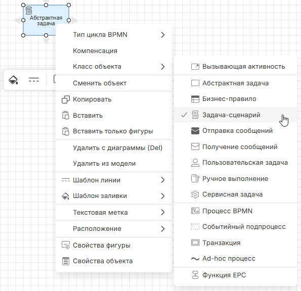Для всех объектов диаграммы можно выбрать другой объект из справочника с помощью пункта контекстного меню Сменить объект. Смена объекта может происходить только в пределах одного класса, при этом на диаграмме процесса в нотации BPMN фигура отображается в соответствии с заданным графическим шаблоном, который соответствует новому объекту.