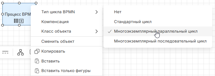 На диаграмме тип цикла для задачи или подпроцесса определяется при помощи подменю Тип цикла BPMN в контекстном меню, вызываемого от задачи или подпроцесса (рис. 2).