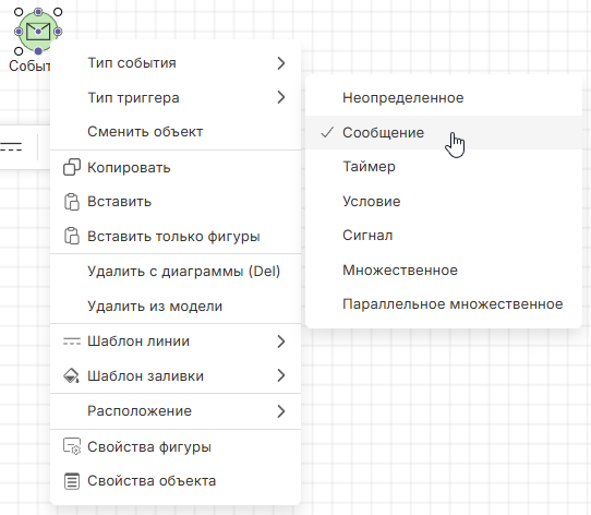По типу триггера события делятся на различные типы, например, «Неопределенное» (без маркера), «Сообщение», «Таймер». Триггер обозначается специальным маркером внутри события. По умолчанию событие добавляется на диаграмму с типом триггера «Неопределенное». На диаграмме тип триггера определяется при помощи подменю Тип триггера в контекстном меню, вызываемом от события (рис. 5).