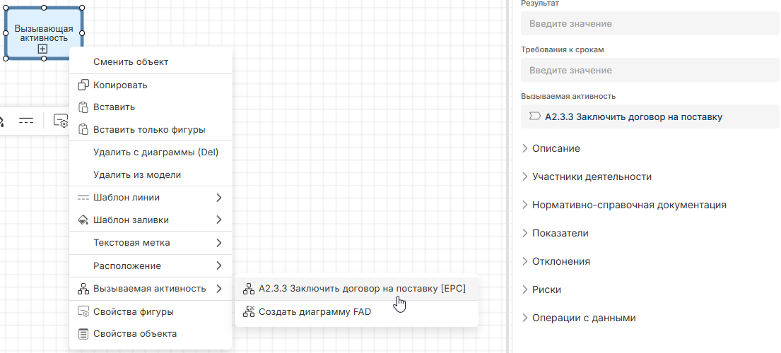 Вызывающая активность может быть добавлена на диаграмму при помощи одноименного символа с Палитры или же путем смены класса объекта, добавленного на диаграмму или в Навигатор. Связь вызывающей активности с вызываемой устанавливается в Окне свойств вызывающей активности в параметре Вызываемая активность. После указания единицы деятельности в качестве значения данного параметра в контекстном меню Вызывающей активности появляется пункт меню Вызываемая активность, выбор которого открывает диаграмму вызываемой активности (рис. 4).