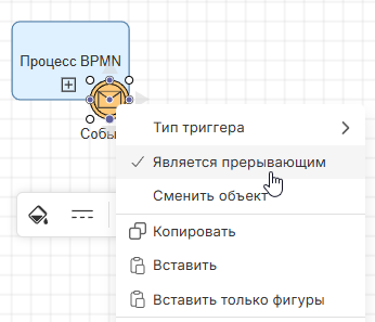 Для добавления граничного события необходимо присоединить событие к границе фигуры так, чтобы появился индикатор присоединения. После присоединения события к границе фигуры, для события можно указать, является ли оно прерывающим при помощи одноименного пункта контекстного меню, вызываемого от события (рис. 7).