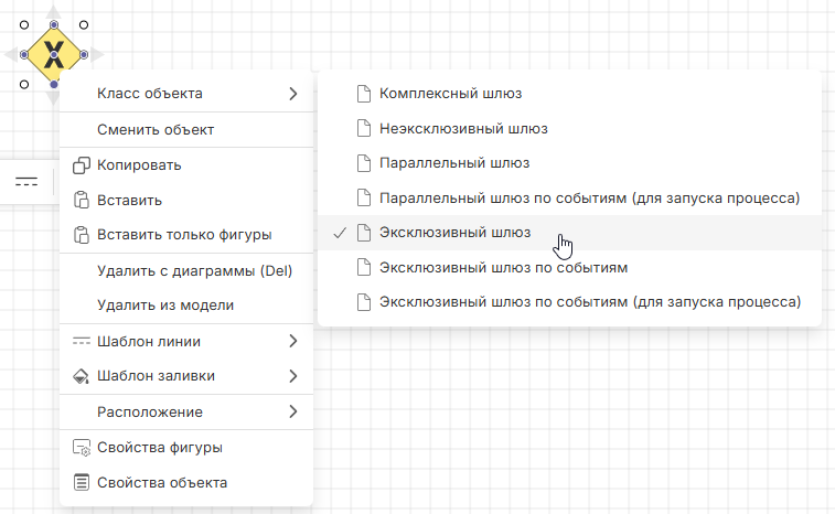 Шлюзы представляют собой точки ветвления и слияния потоков управления процесса. Шлюзы могут быть различных классов. На палитре элементов Окна диаграммы предусмотрены отдельные символы для добавления эксклюзивного шлюза, параллельного шлюза и неэксклюзивного шлюза, а также символ для добавления шлюза с выбором его класса. После добавления шлюза любого класса на диаграмму его класс можно сменить при помощи подменю Класс объекта в контекстном меню, вызываемом от шлюза (рис. 8).