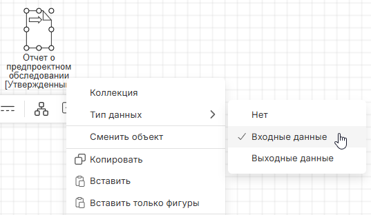 В контекстном меню фигуры объекта данных можно выбрать Тип данных: Входные данные или Выходные данные, а также указать, является ли объект коллекцией.