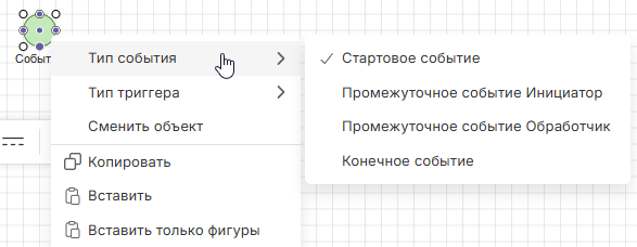 На палитре элементов предусмотрены отдельные кнопки для добавления стартового события, промежуточного события-инициатора и конечного события. После добавления события на диаграмму первоначально выбранный тип события можно изменить при помощи подменю Тип события в контекстном меню, вызываемом от события (рис. 6).