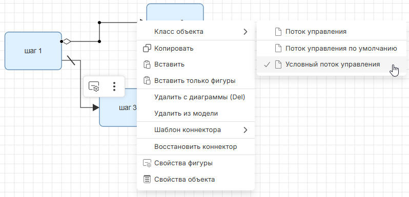 Тип потока управления, исходящего из процесса, можно сменить на условный поток или поток по умолчанию при помощи подменю Класс объекта в контекстном меню, вызываемом от потока управления (рис. 14). Тип потока управления, исходящего из эксклюзивного/неэксклюзивного шлюза, можно сменить на поток управления по умолчанию при помощи этого же пункта меню.