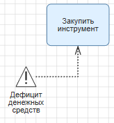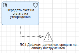 На диаграмме BPMN можно отобразить риски. Для угрозы и возможности предусмотрены свои фигуры. Символ риска не представлен на Палитре элементов, но риск может быть добавлен на диаграмму из справочника. Для связи риска с задачей/подпроцессом предназначен класс связи «Влияние риска» (рис. 19). В этом случае задача/подпроцесс является объектом риска.