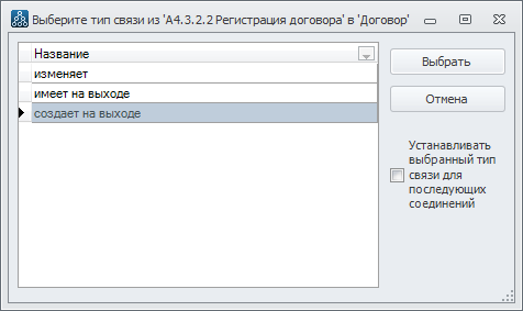При добавлении связи между двумя элементами на диаграмме будет выдано окно для выбора типа связи между этими элементами (Рис. 12). Изменить тип связи впоследствии можно в свойствах связи. Если в справочнике типов связей между данными элементами существует только одна запись - будет автоматически создана связь с этим типом.