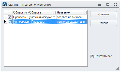 на панели инструментов. При нажатии на кнопку будет открыто окно для выбора умолчаний типов связей, которые необходимо удалить (Рис. 13).
