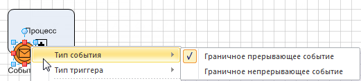 После присоединения события к границе фигуры, тип события (граничное прерывающее, граничное непрерывающее) можно изменить при помощи подменю Тип события в контекстном меню, вызываемом от события (Рис. 9). Тип триггера можно сменить при помощи подменю Тип триггера в контекстном меню, вызываемом от события (см. Рис. 7).