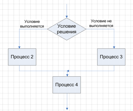Объект "Решение" обозначает условие, определяющее следующее выполняемое действие. Фигура "Решение" может иметь на диаграмме несколько входящих стрелок типа "Связь предшествования" и ряд альтернативных выходящих стрелок типа "Связь предшествования", одна и только одна из которых может быть активизирована после проверки условия. Выходящие стрелки помечаются, например, как "Да" или "Нет", или другим способом для учета всех возможных вариантов ветвления. Вид диаграммы процесса с использованием объекта "Решение" показан на Рис. 2.