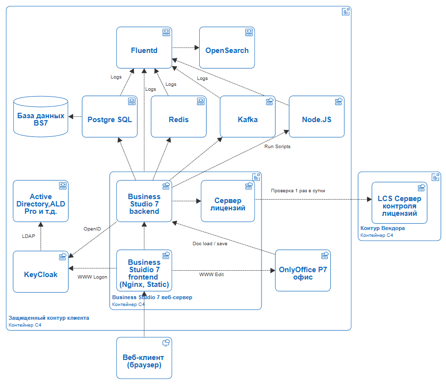 - Business Studio 7 frontend (nginx) - пользовательская, внешняя часть Business Studio, веб страницы и скрипты для исполнения в браузере. Это все визуальные элементы, интерфейсы и интерактивные функции. Nginx служит для маршрутизации запросов между cтатическим контентом BS, BS backend, KeyCloak, OnlyOffice.