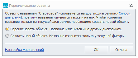 В Настройках пользователя в параметре Настройки уведомлений можно включить уведомления при переименовании объекта, используемого на нескольких диаграммах. Если попытаться переименовать объект, который используется на нескольких диаграммах, на экран будет выведено окно "Переименование объекта" с другим наполнением, чем показано на рисунке 18 выше (см. Рис. 19), в котором будет предложено выбрать одно из действий: