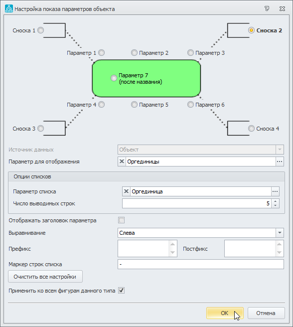 | Область вывода параметра | Задается кликом мыши в одном из предустановленных переключателей. Выбор области определяет, как будет расположен выводимый параметр относительно блока фигуры на диаграмме. В области с пометкой Сноска удобно выводить списки, а в области с пометкой Параметр - обычные параметры объекта, но данная привязка не является жесткой: можно также выводить в области с пометкой Сноска обычные параметры, а в области с пометкой Параметр - списки объекта. |