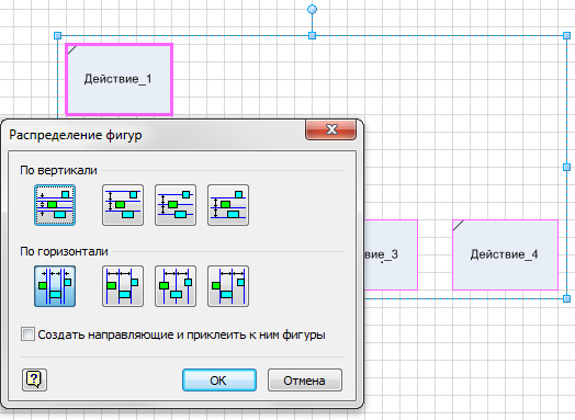 С помощью пункта меню Распределение фигур (панель инструментов Окна диаграммы → кнопка Действия → Положение фигур) производится распределение фигур. Распределить можно три и более выделенных фигуры. В окне Распределение фигур (Рис. 28) выбирается вариант распределения фигур по заданным осям.