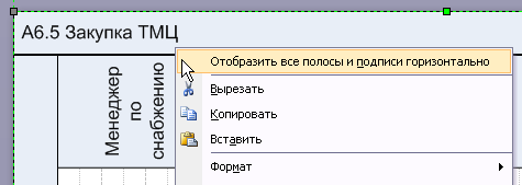 В MS Visio 2003 и 2007 направление текста в заголовках колонок можно изменить, сделав его вертикальным (горизонтальным). Щелкните правой кнопкой мыши по полю заголовка и выберите в контекстном меню пункт Display All Band Labels Vertically (Horizontally) или Отобразить все полосы и подписи вертикально (горизонтально). На Рис. 17 расположение заголовков на диаграмме процедуры изменено на вертикальное.