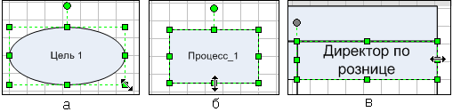 Размеры фигуры на диаграмме можно изменять. Для этого сначала выделите фигуру нажатием мыши, затем наведите курсор мыши на одну из меток на гранях выделенной фигуры, нажмите левую кнопку мыши и, удерживая ее, перемещайте мышь, пока фигура не примет нужный размер. На Рис. 7 приведены примеры изменения размеров различных фигур (а - изменение размера цели на диаграмме стратегической карты; б - изменение размера единицы деятельности на диаграмме процесса в нотации Cross-functional Flowchart; в - изменение размера оргединицы на диаграмме процесса в нотации Cross-functional Flowchart).