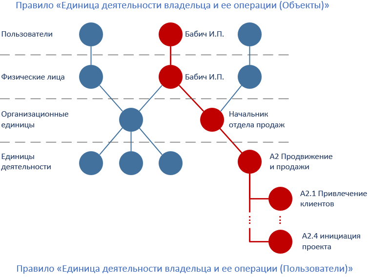 От пользователя Бабич Ирина Петровна получается одноименное физическое лицо, с котором связан пользователь. От физического лица получается оргединица Начальник отдела продаж. От оргединицы получается функция А2 Продвижение и продажи, для которой Начальник отдела продаж является владельцем, а также его подфункции. Таким образом, по правилу "Единица деятельности владельца и ее операции (Объекты)" (см. Рисунок 1) объекту начального класса (Пользователи) найдено соответствие с объектом конечного класса (Единицы деятельности). Объект А2 Продвижение и продажи и его дочерние объекты при выполнении данного правила будут доступны пользователю Бабич Ирина Петровна в разделе Бизнес модель на портале.