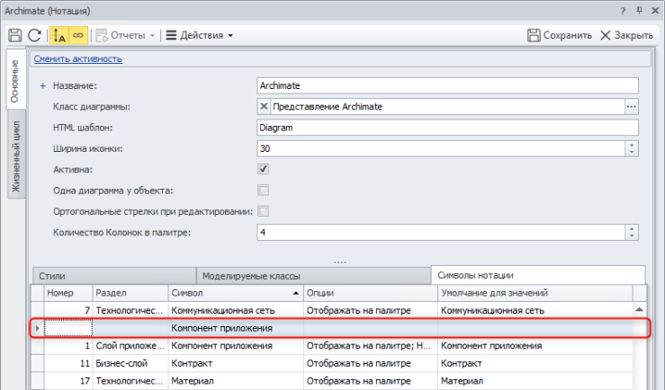 - Настроить существующую строку списка «Символы нотации», чтобы она применялась только для новых объектов при дропе символа с палитры. При этом будет создаваться новый объект фиксированного класса «Компонент приложения».