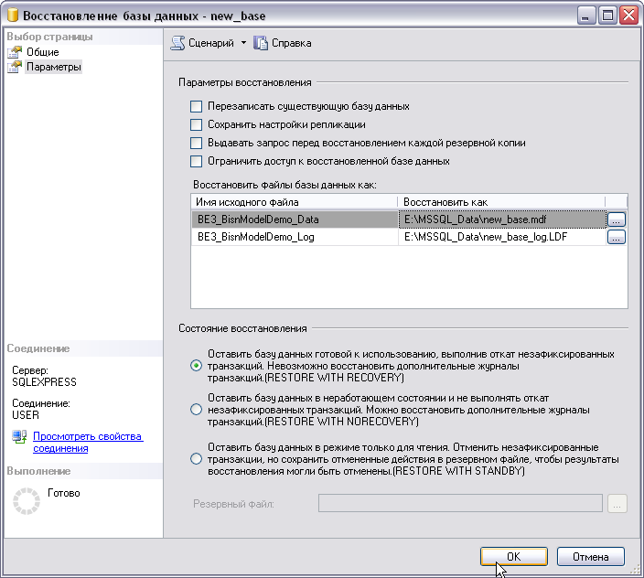 При необходимости выбрать путь хранения новой базы данных. Для этого в окне "Восстановление базы данных" на странице Параметры (Рис. 2) редактируется колонка Восстановить как.
