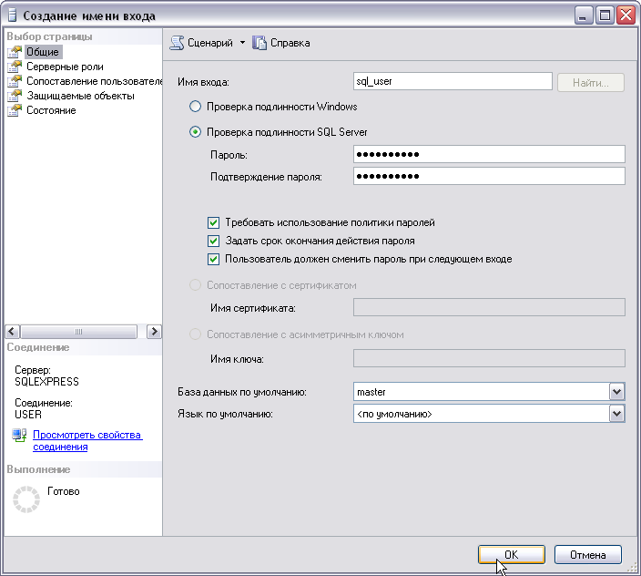 Создание и редактирование свойств пользователей осуществляется из раздела Безопасность дерева объектов SQL Server Management Studio1). Для добавления нового пользователя необходимо выделить раздел Имена входа, в контекстном меню выбрать пункт "Создать имя входа…". Откроется окно "Создание имени входа" (Рис. 1).