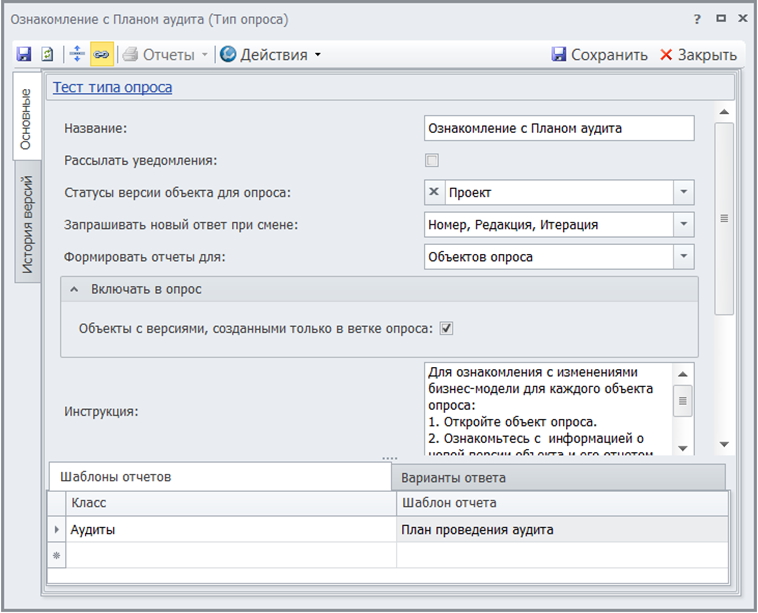 Также для Роли пользователя важно создать Тип опроса. Например, «Ознакомление с Планом аудита» или «Ознакомление с Отчетом по аудиту»), в котором указываются шаблоны отчетов (План проведения аудита или Отчет по аудиту соответственно), которые будут формироваться для ознакомления.