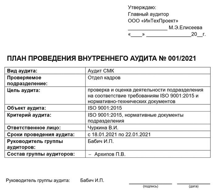 Все аудиты в Компании обычно проводятся на основе составленной программы аудитов на год. Если же в Компании проводятся не только аудиты СМК, но и другие проверки, то для каждого вида таких проверок создается своя программа.