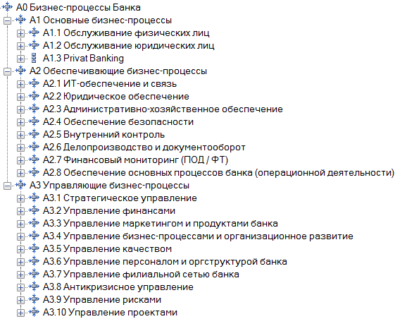 Рис. 2. Дерево (реестр) бизнес-процессов банка (верхний уровень)