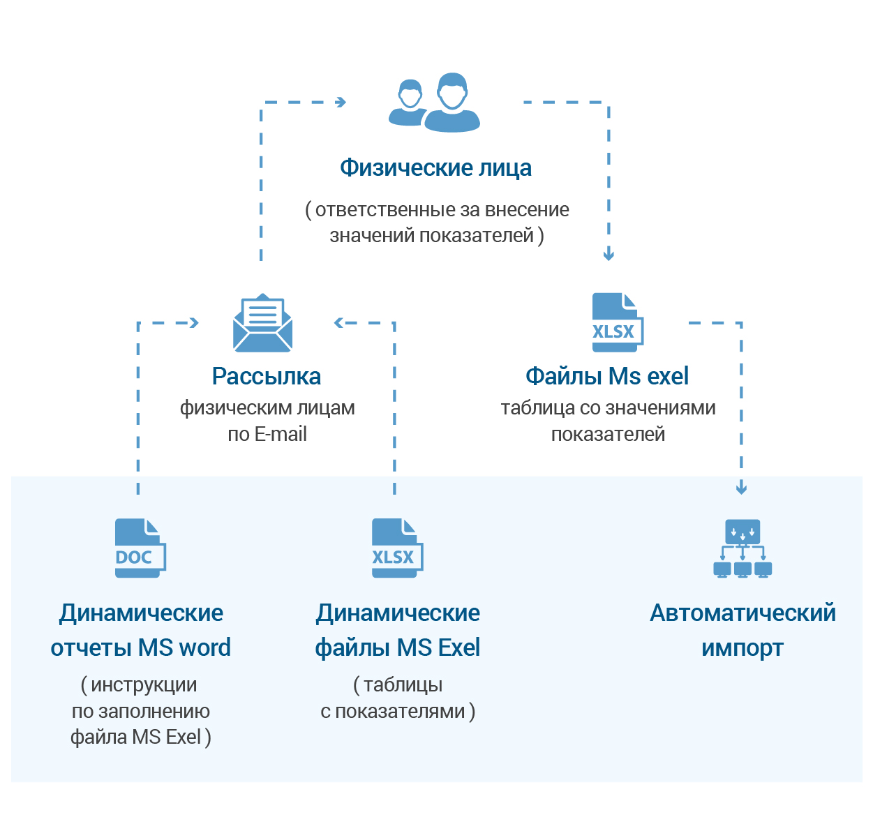 Для каждого физического лица, являющегося ответственным за внесение значений показателей в систему, формируется динамическое письмо с инструкцией по заполнению отчетной таблицы. Система Business Studio 2.0 находит все показатели для данного физического лица и формирует файл Microsoft Excel, содержащий таблицу с показателями, за внесение значений которых данное физическое лицо является ответственным. К письму прикрепляется данный файл, и затем эти письма с файлами рассылаются по электронному адресу (