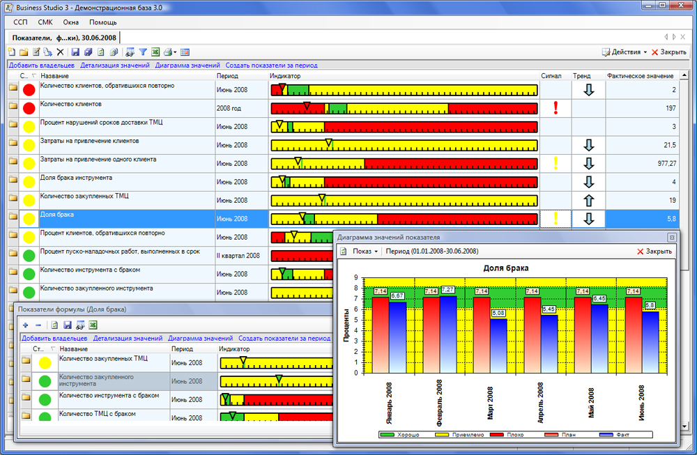 Рис. 3. Кокпит, окно показателей с выделенным составным показателем, окно декомпозиции поверх него