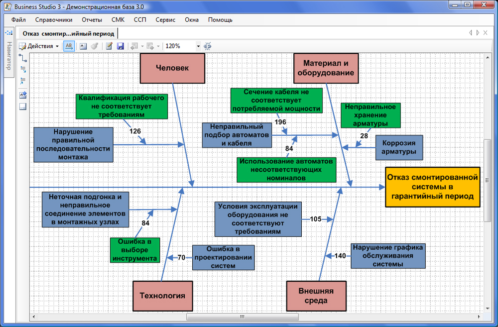 Business Studio 3.0 поддерживает методику анализа несоответствий, их последствий и причин возникновения (FMEA6) с применением диаграммы Исикавы.