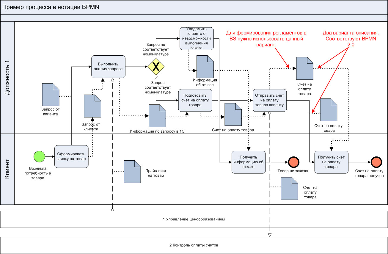 Обратите внимание на документ «Запрос от клиента», показанный в левом верхнем углу схемы рис. 1. Этот документ «повис в воздухе». В нотации BPMN2.0 не предусмотрена возможность моделирования информационных (материальных) потоков между пулами.