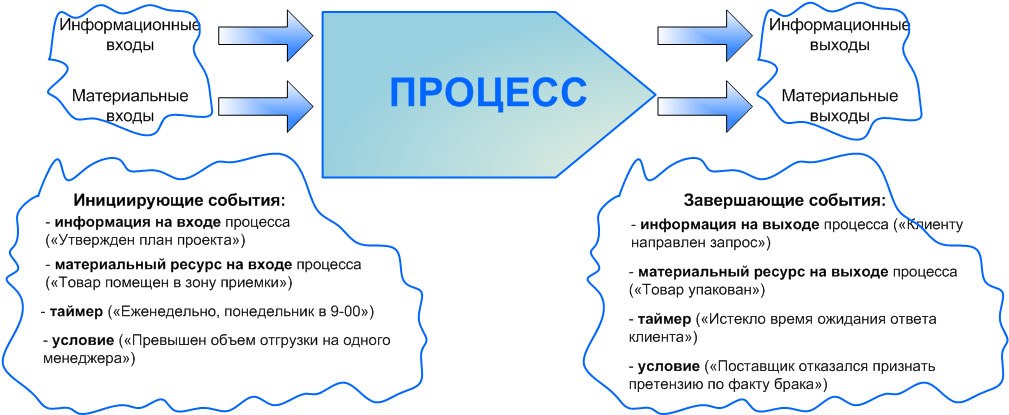 Входы/выходы процесса — это информационные или материальные ресурсы. При определении границ процесса важно четко определить требования к этим ресурсам. Это можно сделать при помощи разного рода спецификаций. Кроме того, желательно продумать, как именно (по какой методике) нужно будет проверять соответствие входящего/исходящего ресурса установленной спецификации (требованиям).