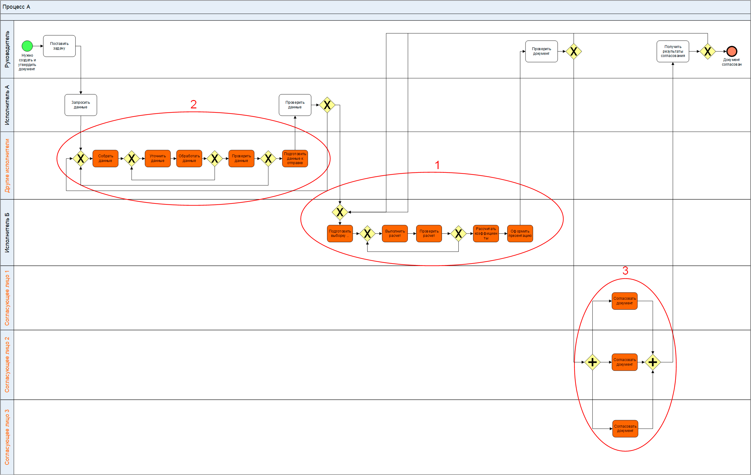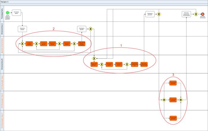 Обратите внимание на группу задач на рис. 1, обведенных овалом под номером 2. Его выполняют «Другие исполнители». Можно было бы создать несколько дорожек, но я специально не стал усложнять схему.