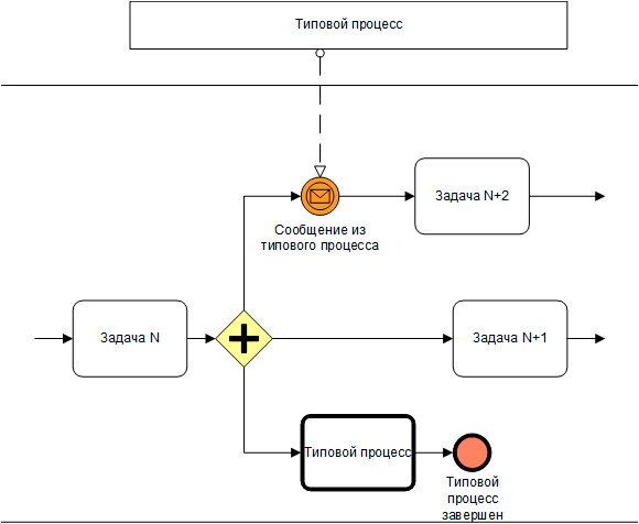 Как работает такая модель? По ходу выполнения запущенный из нашего процесса экземпляр типового процесса отправляет сообщение, которое обрабатывается. Это кажется немного странным (и для многих спорным), но может использоваться.