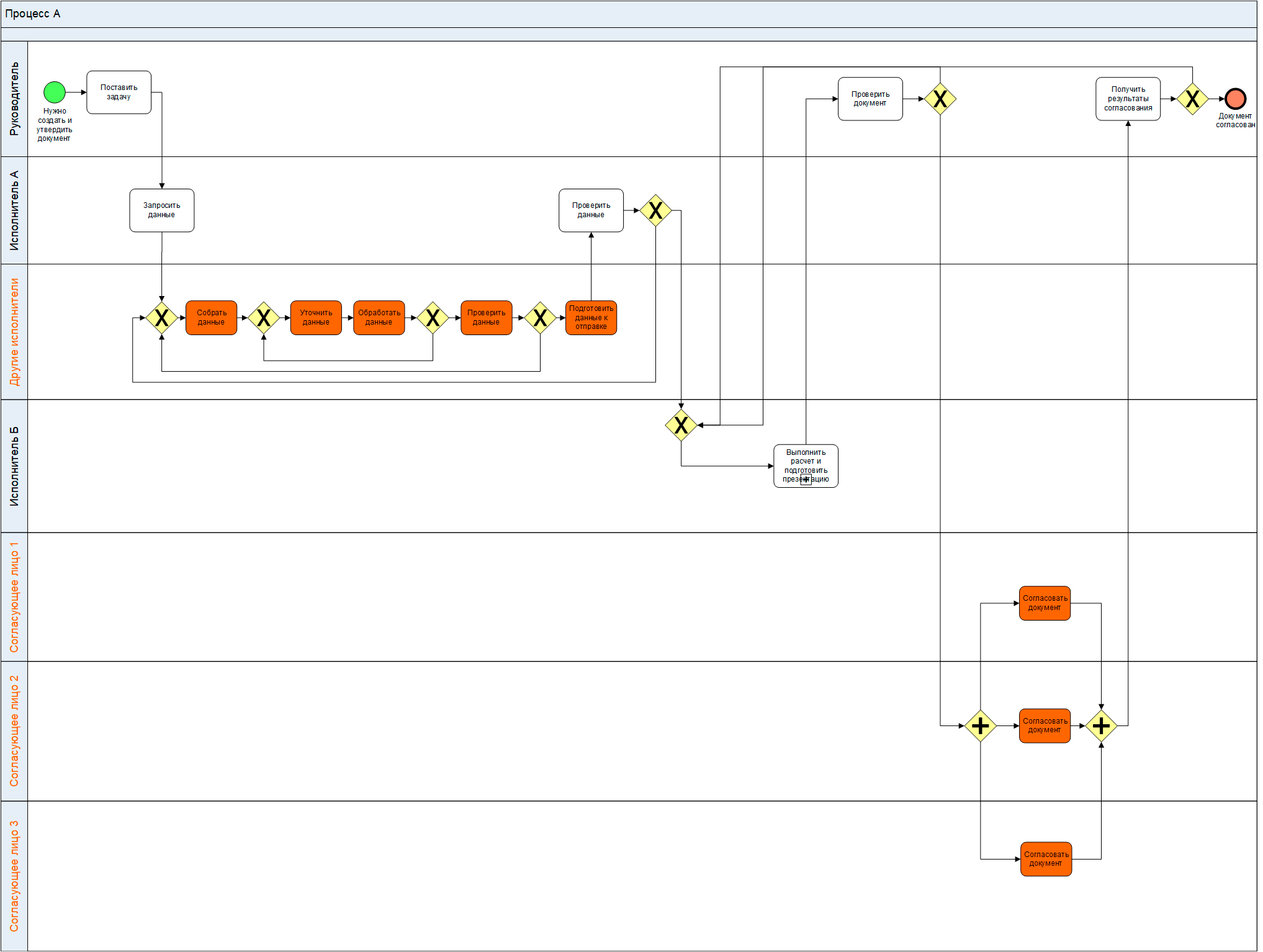 На схеме Процесса А удалим группу задач согласования (овал № 3) и соответствующие дорожки, закроем схему, скопируем в навигаторе процесс «Согласовать документ» и вставим его как задачу в Процесс А, обязательно используя опцию «Вставить как ссылку», откроем схему Процесса А на редактирование и внесем необходимые изменения. На рис. 11 показана готовая схема Процесса А.