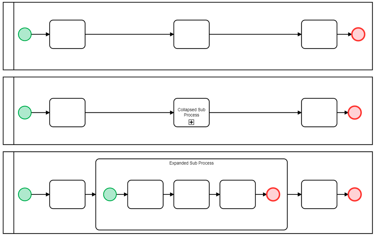 В BPMN используется два понятия: Collapsed Sub Process («Свернутый») и Extended Sub Process («Раскрытый»). Первый показывается в виде задачи с маркером «+» внутри квадрата, второй — в виде схемы процесса. На рис. 3 показан пример: схема без Sub Process (вверху), Collapsed Sub Process (в середине) и Extended Sub Process (внизу).