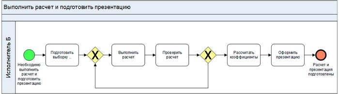 На рис. 4 показана схема подпроцесса «Выполнить расчет и подготовить презентацию». В данном случае исполнитель тот же самый, что и на верхнем уровне, так что все корректно (с точки зрения регламентации в Business Studio).