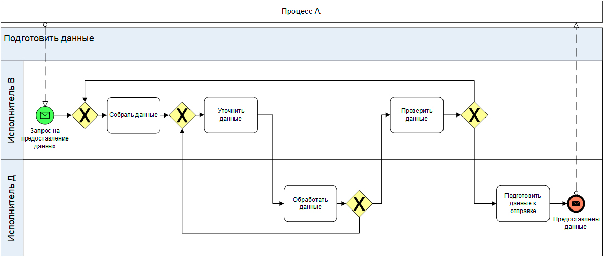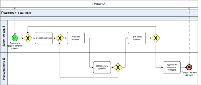 Измененная модель показана на рис. 5. Исполнитель А выполняет задачу «Запросить данные». После нее показано промежуточное событие «Запрос на предоставление данных», которое инициирует на выполнение процесс «Подготовить данные». Он показан в виде свернутого пула над схемой. От события к нему проведена стрелка типа Message Flow.