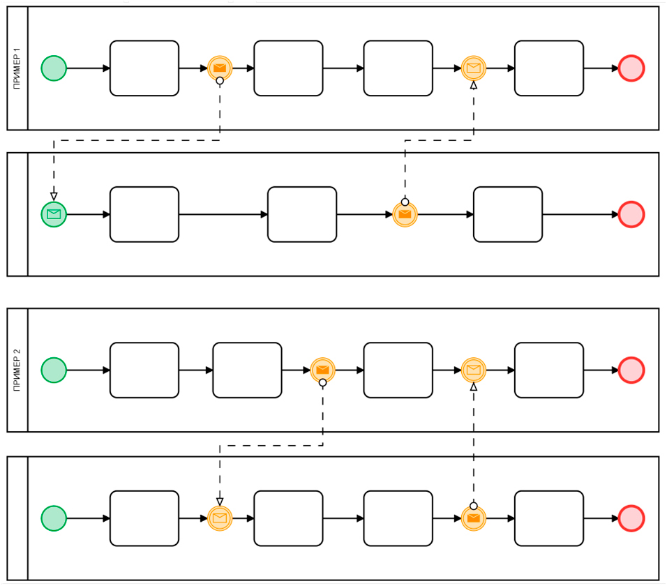 Пример 1. Первый процесс запускается событием неопределенного типа, например человеком. После выполнения первой задачи отправляется сообщение, которое инициирует выполнение второго процесса. Стартовое событие второго процесса — сообщение. После выполнения двух задач второй процесс отправляет в первый ответное сообщение. Первый процесс, в свою очередь, находится в режиме ожидания получения сообщения после выполнения третьей задачи.