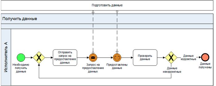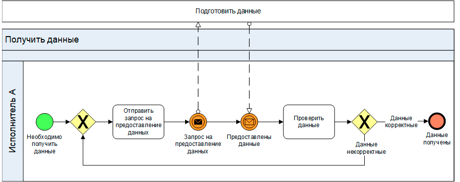 После отправки сообщения поток процесса идет далее и останавливается на событии ожидания сообщения «Предоставлены данные». Когда оно приходит из процесса «Подготовить данные», Процесс А продолжается. Выполняется проверка данных. Если данные некорректные, то происходит возврат и повторный запуск процесса «Подготовить данные». Видно, что схема процесса (рис. 5) стала значительно проще.
