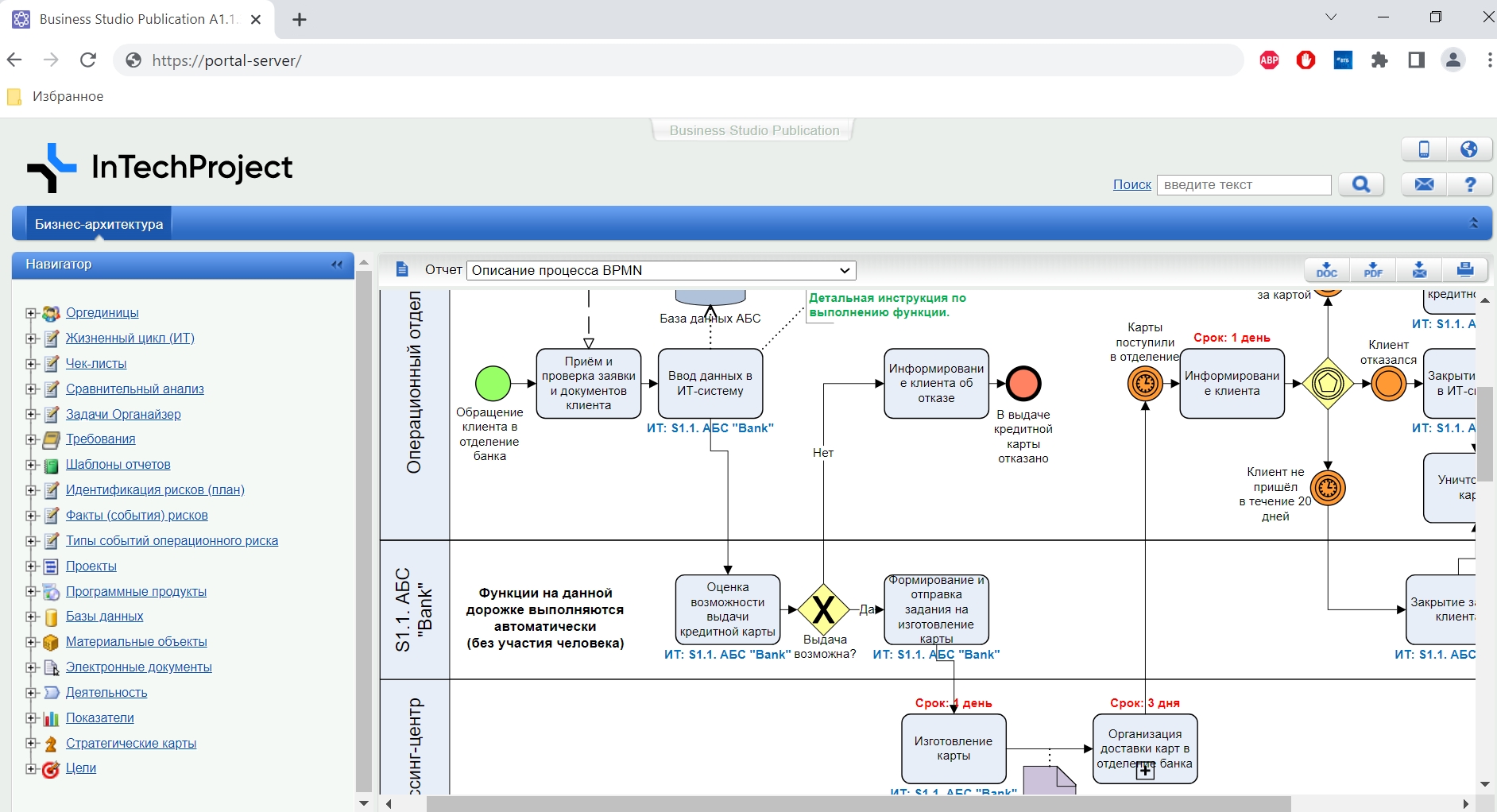 - Навигатор (слева). Через него осуществляется доступ ко всем моделям и документам. С помощью кнопок «плюс / минус» можно разворачивать и сворачивать дерево процессов, организационную структуру, библиотеку документов, ИТ-архитектуру и т. д. При нажатии на конкретный объект для него отрывается набор отчётов, документов и моделей.