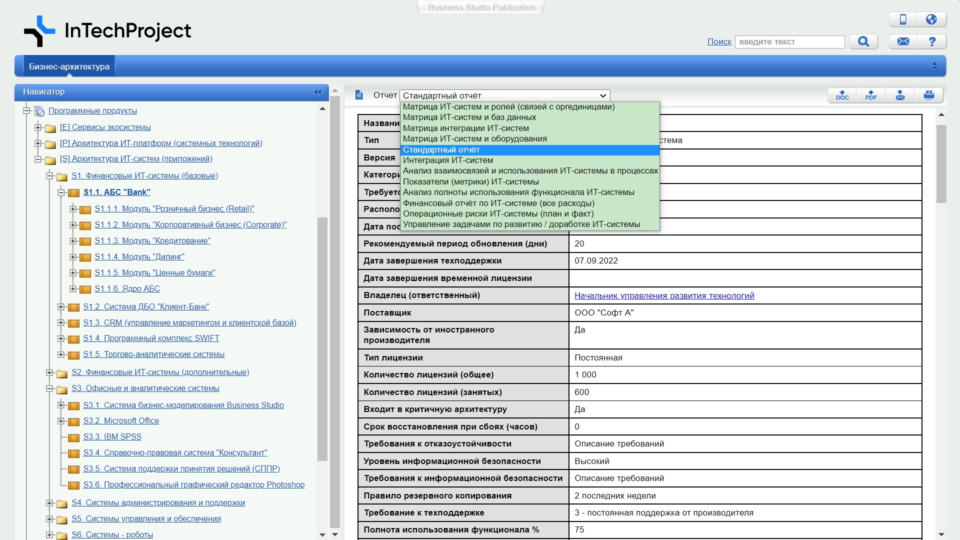 - Автоматическое обновление информации (карточки объектов, отчёты, документы) по расписанию на основе базы данных, в которой ведётся разработка и актуализация ИТ-архитектуры.